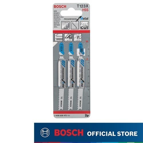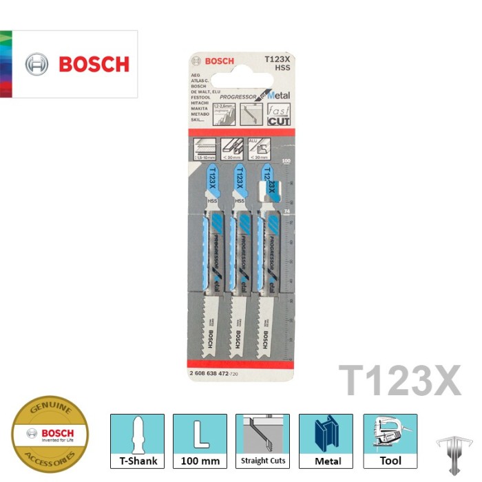 Bilah Jigsaw T 123 XF Progressor for Metal bersifat tahan pecah dan memberikan potongan lurus cepat untuk digunakan pada logam tebal dan tipis.