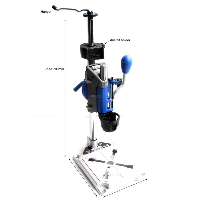 Ini adalah bor press. dudukan perkakas dan dudukan poros fleksibel dalam satu perkakas. Buat lubang yang bersiku dan tegak lurus dengan pengeboran. Memastikan perkakas Anda tetap di posisinya saat digunakan untuk pengampelasan dan penghalusan. serta dudukan poros fleksibel dapat dipanjangkan antara 16 hingga 29 inci.